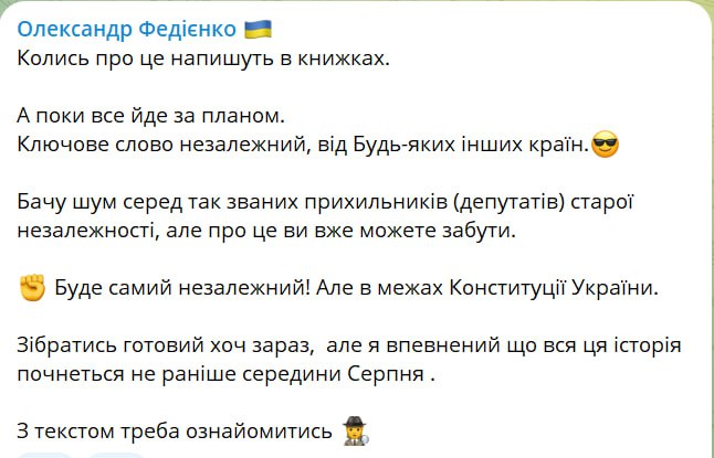 "Собраться готов хоть сейчас, но я уверен, что вся эта история начнется не раньше середины августа. С текстом нужно ознакомиться", – написал Федиенко в соцсети.