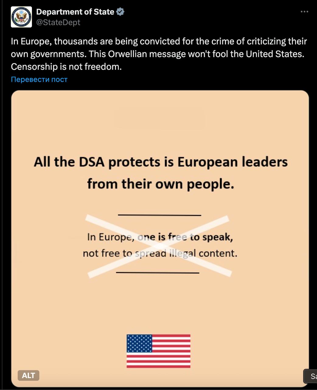 "В Европе тысячи людей осуждены за критику собственного правительства. Это оруэлловское послание не обманет Соединённые Штаты. Цензура - это не свобода", - написал Госдепартамент на своей странице в Х.