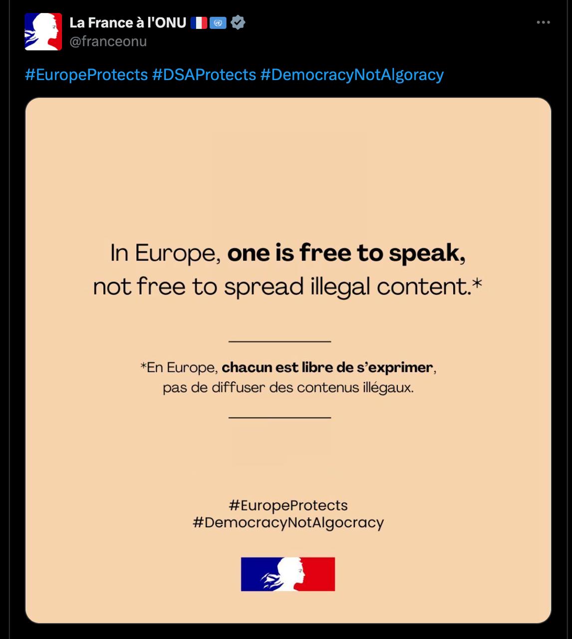 Так Госдеп отреагировал на картинку представительства Франции при ООН, где говорится, что "в Европе можно свободно говорить, но нельзя свободно распространять незаконный контент".