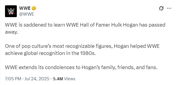 "WWE с грустью сообщает о кончине Халка Хогана, члена Зала славы WWE. Будучи одной из самых узнаваемых фигур поп-культуры, Хоган помог WWE добиться мирового признания в 1980-х", - говорится в публикации WWE в соцсети X.