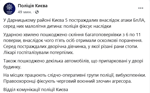 В Дарницком районе Киева пять человек пострадали в результате атаки РФ, среди них двухлетний ребенок, сообщает Нацполиция.