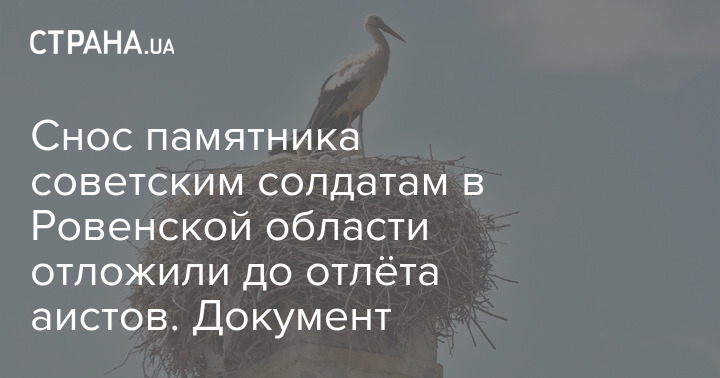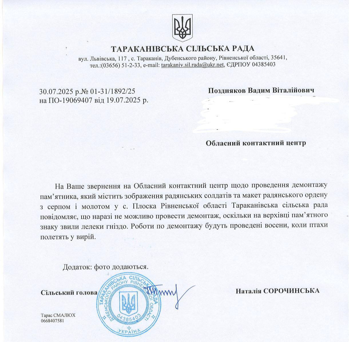 "По Вашему обращению по проведению демонтажа памятника, содержащего изображения советских солдат и макет советского ордена с серпом и молотом в с. Плоска Ровенской области Таракановский сельский совет сообщает, что пока невозможно провести демонтаж, поскольку на верхушке памятного знака свили гнездо аисты. Работы по демонтажу будут проведены осенью, когда птицы улетят в тёплые края", – сказано в документе.