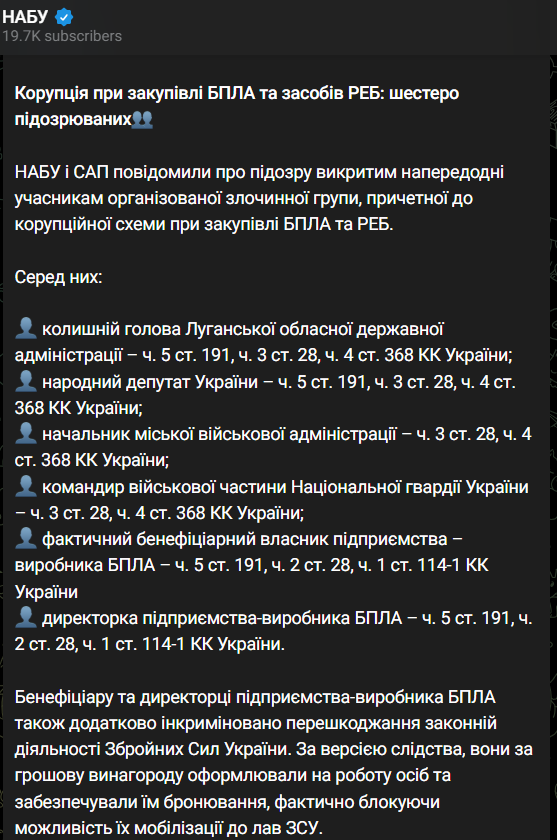 Национальное антикоррупционное бюро Украины сообщило о подозрении шестерым подозреваемым по делу о коррупции на закупке беспилотников и РЭБ. В том числе народному депутату Алексею Кузнецову и экс-главе Мукачевской РГА Сергею Гайдаю.