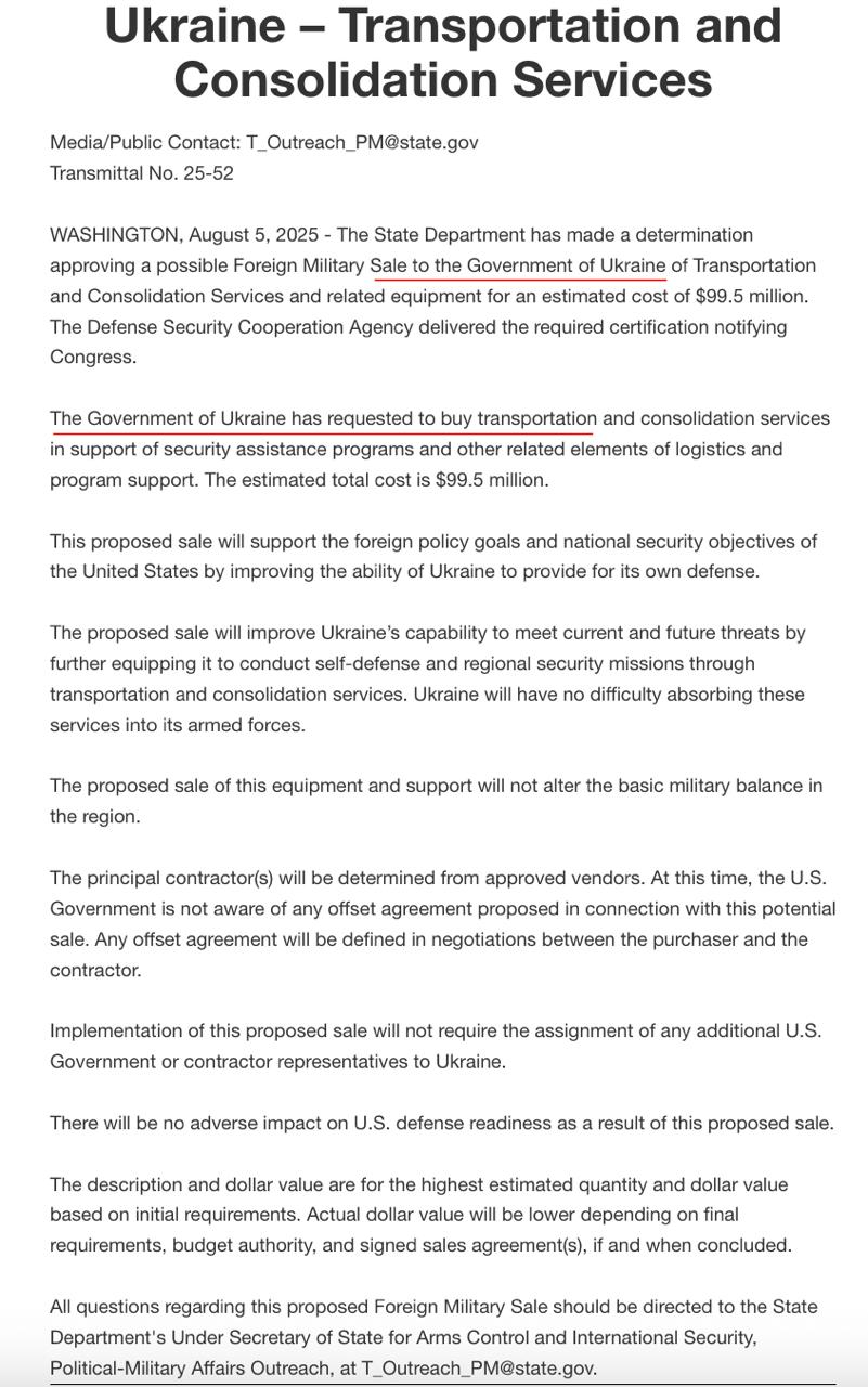 Вчера, 5 августа, Госдеп заявил, что одобрил два контракта: на $104 млн на ремонт, запчасти и обслуживание гаубиц М777; и на $99,5 млн на транспортные услуги и поддержку логистики.