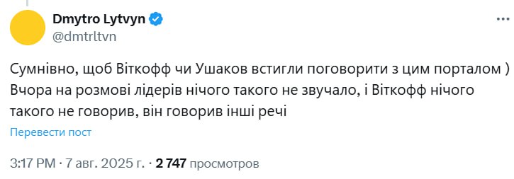 "Сомнительно, чтобы Уиткофф или Ушаков успели поговорить с этим порталом. Вчера на разговоре лидеров ничего такого не звучало, и Уиткофф ничего такого не говорил, он говорил другие вещи", - написал советник Зеленского.