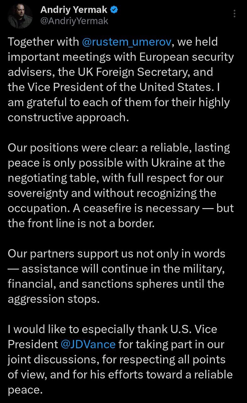 "Наша позиция была ясной: надёжный и прочный мир возможен только при участии Украины за столом переговоров, с полным уважением нашего суверенитета и без признания оккупации. Перемирие необходимо - но линия фронта не является границей", - написал глава ОП.