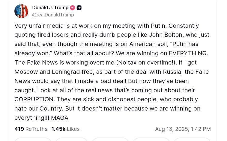 Президент США Дональд Трамп заявил, что американские СМИ публикуют лживую информацию по поводу его предстоящей встрече на Аляске с главой Кремля Владимиром Путиным. В частности, американского президента разозлил тезис его бывшего советника по национальной безопасности Джона Болтона о том, что "Путин уже победил", когда Трамп согласился на встречу с ним.