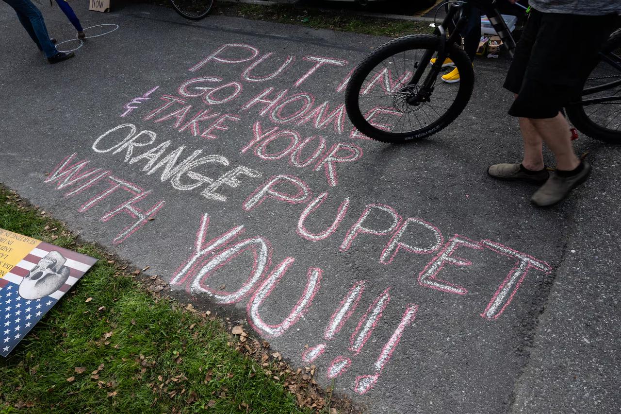 Некоторые митингующие назвали американского президента "оранжевой куклой Путина".