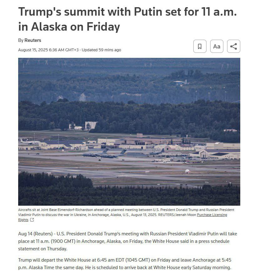 15:00 Трамп вылетает на Аляску на встречу с Путиным.