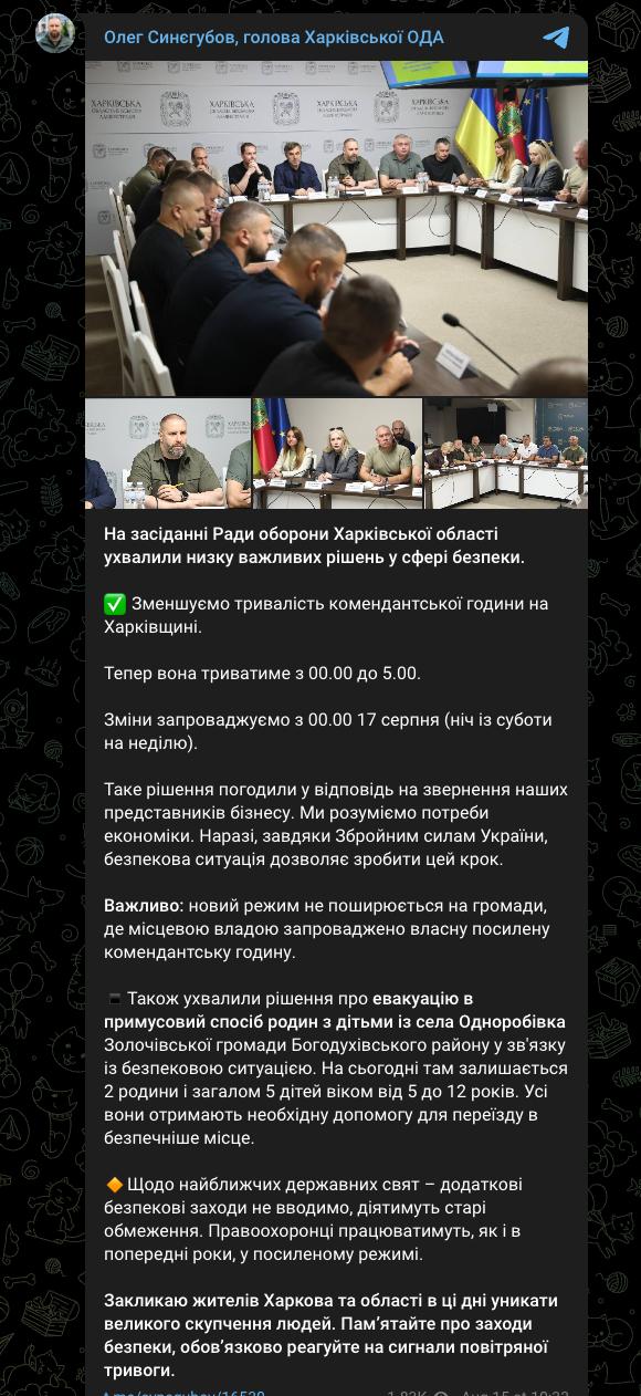 С 17 августа он будет длиться с 00:00 до 05:00, сообщил руководитель ОВА Олег Синегубов. Ранее комендантский час начинался в 23:00.