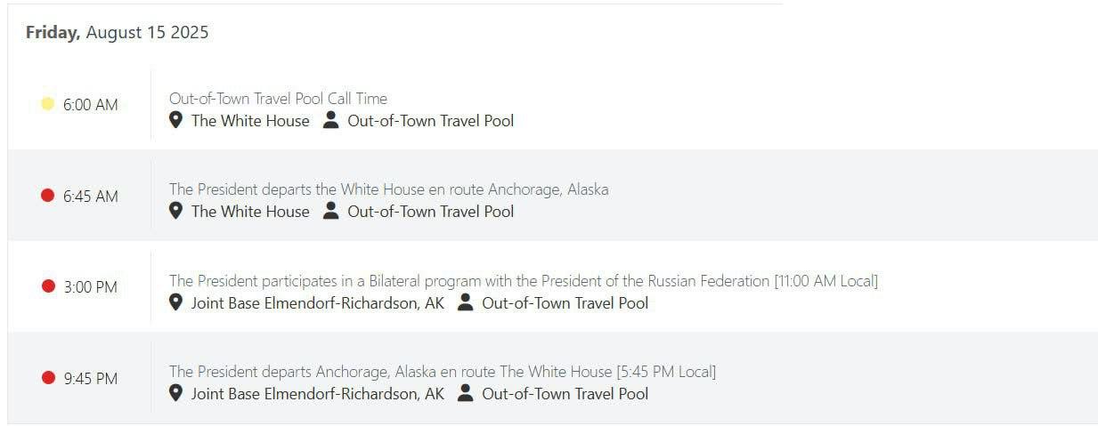 11:53 Белый дом опубликовал график Трампа в день встречи с Путиным на Аляске.