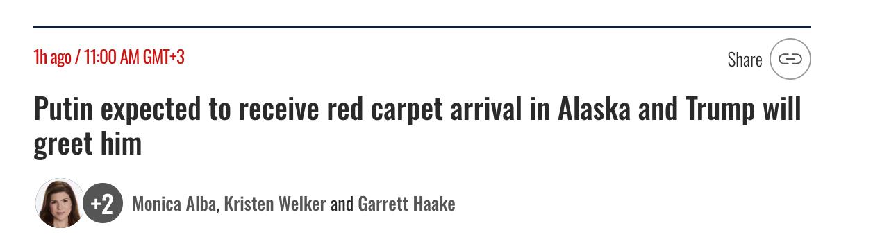 15:50 Губернатор Аляски подтвердил, что Трамп будет лично встречать Путина.