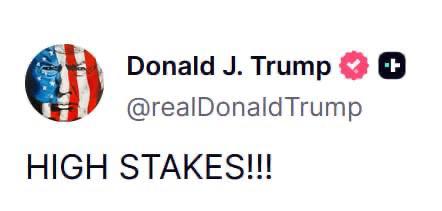 14:06 "Высокие ставки!" - написал Трамп в своей соцсети.