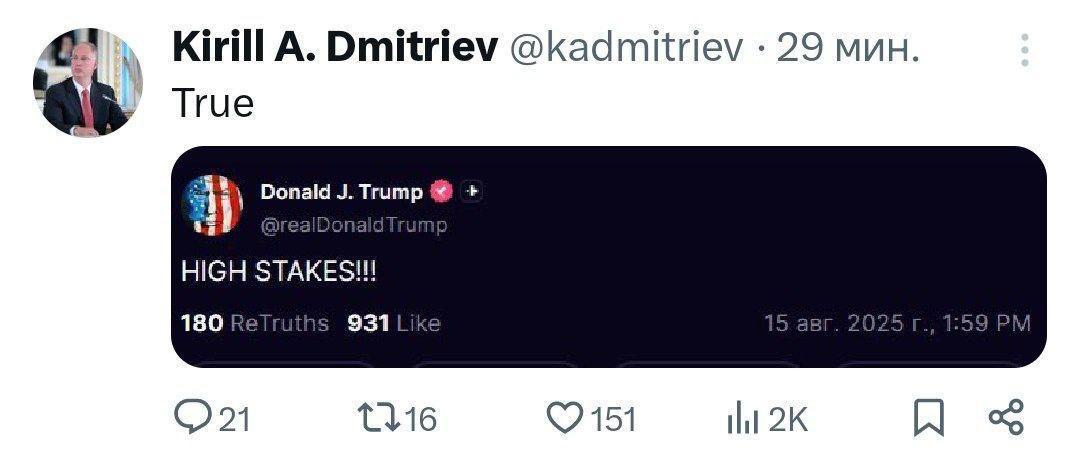 14:55 "Правда", - прокомментировал спецпредставитель Кремля Дмитриев слова Трампа про "высокие ставки" накануне встречи на Аляске.