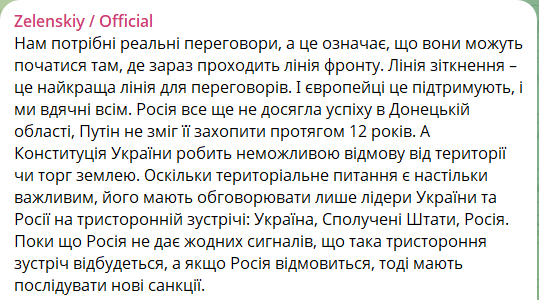 "Россия до сих пор не добилась успеха в Донецкой области, Путину не удалось захватить её на протяжении 12 лет. А Конституция Украины делает невозможным отказ от территории или торговлю землёй. Поскольку территориальный вопрос имеет столь большое значение, его должны обсуждать исключительно лидеры Украины и России на трёхсторонней встрече: Украина, Соединённые Штаты, Россия. Пока что Россия не подаёт никаких сигналов, что такая встреча состоится, а если Россия откажется, то должны последовать новые санкции", – сказал Зеленский.