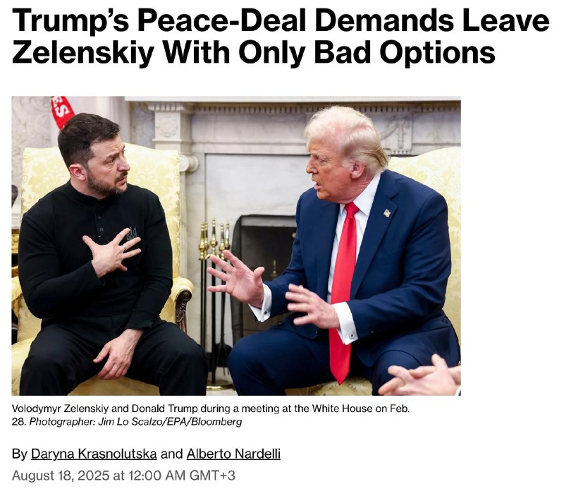 Bloomberg отмечает, что после саммита на Аляске, который не привел к прекращению огня, Трамп "практически не оставил Зеленскому пространства для манёвра".