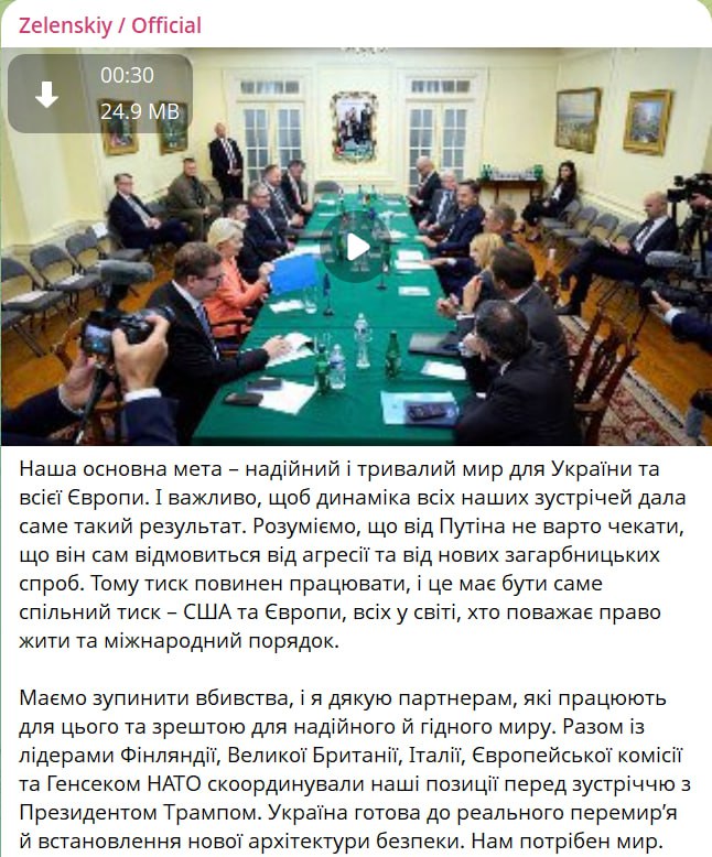 "Наша основная цель – надежный и продолжительный мир для Украины и всей Европы. И важно, чтобы динамика всех наших встреч дала именно такой результат. Понимаем, что от Путина не стоит ожидать, что он сам откажется от агрессии и новых захватнических попыток. Поэтому давление должно работать, и это должно быть именно общее давление – США и Европы, всех в мире, уважающих право жить и международный порядок", - написал Зеленский.
