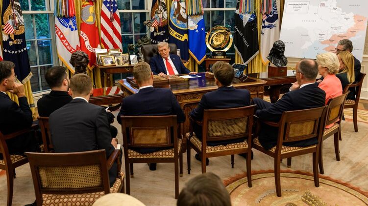 Вчера вечером Зеленский с "группой поддержки" из лидеров Европы и генсека НАТО побывали в Белом доме. Трамп сперва около часа пообщался с украинским президентом с глазу на глаз (они при этом стояли возле карты Украины, где были закрашены захваченные территории).