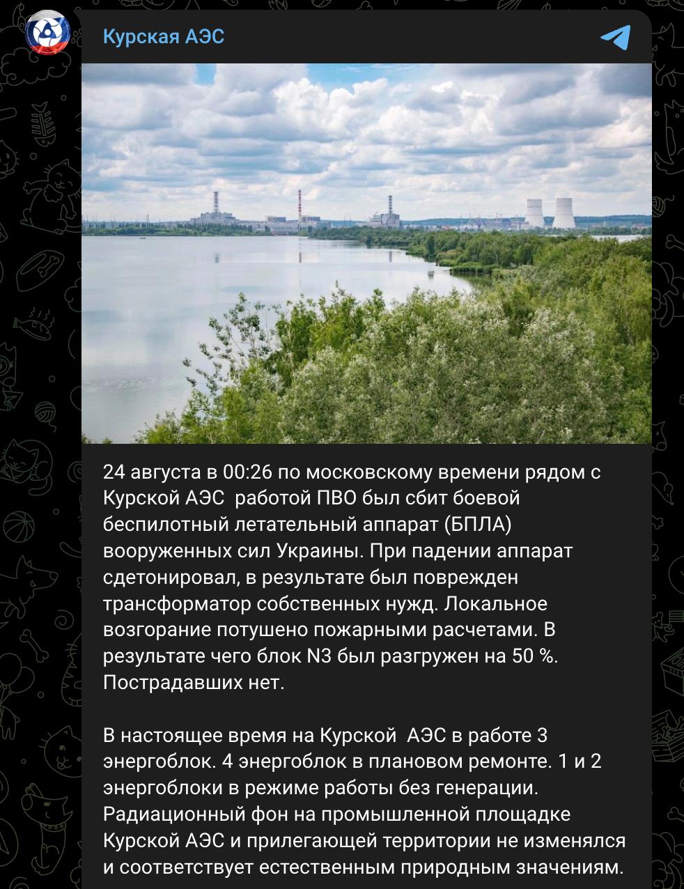08:35 Из-за атаки беспилотника на Курской АЭС понизили мощность энергоблока, сообщает пресс-служба станции.