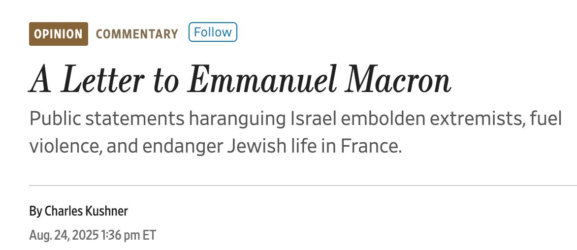 "В 81-ю годовщину освобождения Парижа союзниками, положившего конец депортации евреев с французской земли, я выражаю глубокую обеспокоенность резким ростом антисемитизма во Франции и отсутствием достаточных мер со стороны вашего правительства по противодействию ему. Во Франции не проходит и дня, чтобы евреи не подверглись нападениям на улицах, не были осквернены синагоги или школы или чтобы не были разгромлены принадлежащие евреям предприятия. Ваше Министерство внутренних дел сообщило об антисемитских инцидентах даже в детских садах. Публичные заявления, направленные против Израиля, и жесты в пользу признания палестинского государства поощряют экстремистов, разжигают насилие и ставят под угрозу жизнь евреев во Франции. В современном мире антисионизм — это антисемитизм, простой и понятный", - написал Кушнер.