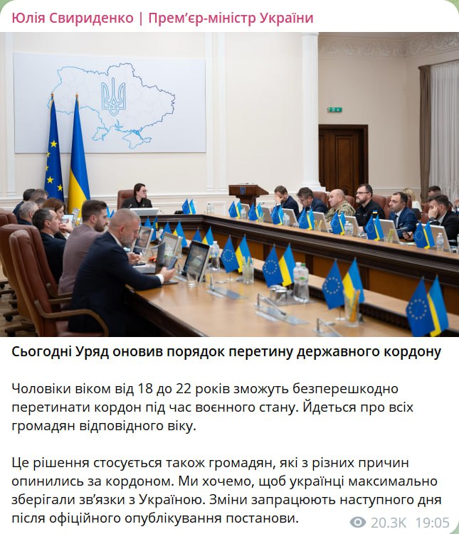 Также Свириденко сообщила, что решение правительства о разрешении выезжать из Украины для парней 18-22 лет касается и тех, которые сейчас находятся за границей.