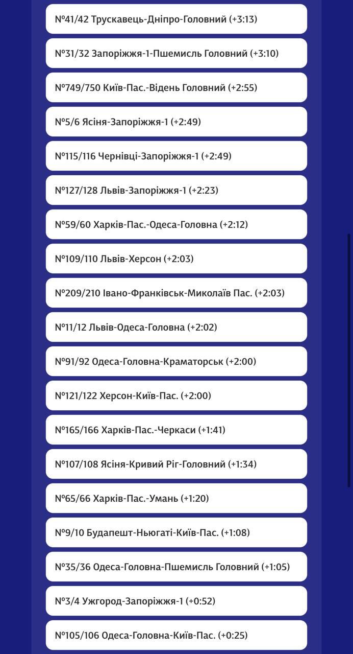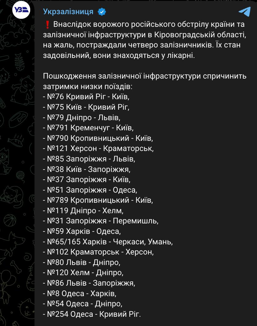 9.06 Задержки поездов из-за удара по железнодорожной инфраструктуры в Кировоградской области уже достигают 7 часов, сообщает Укрзализныця.