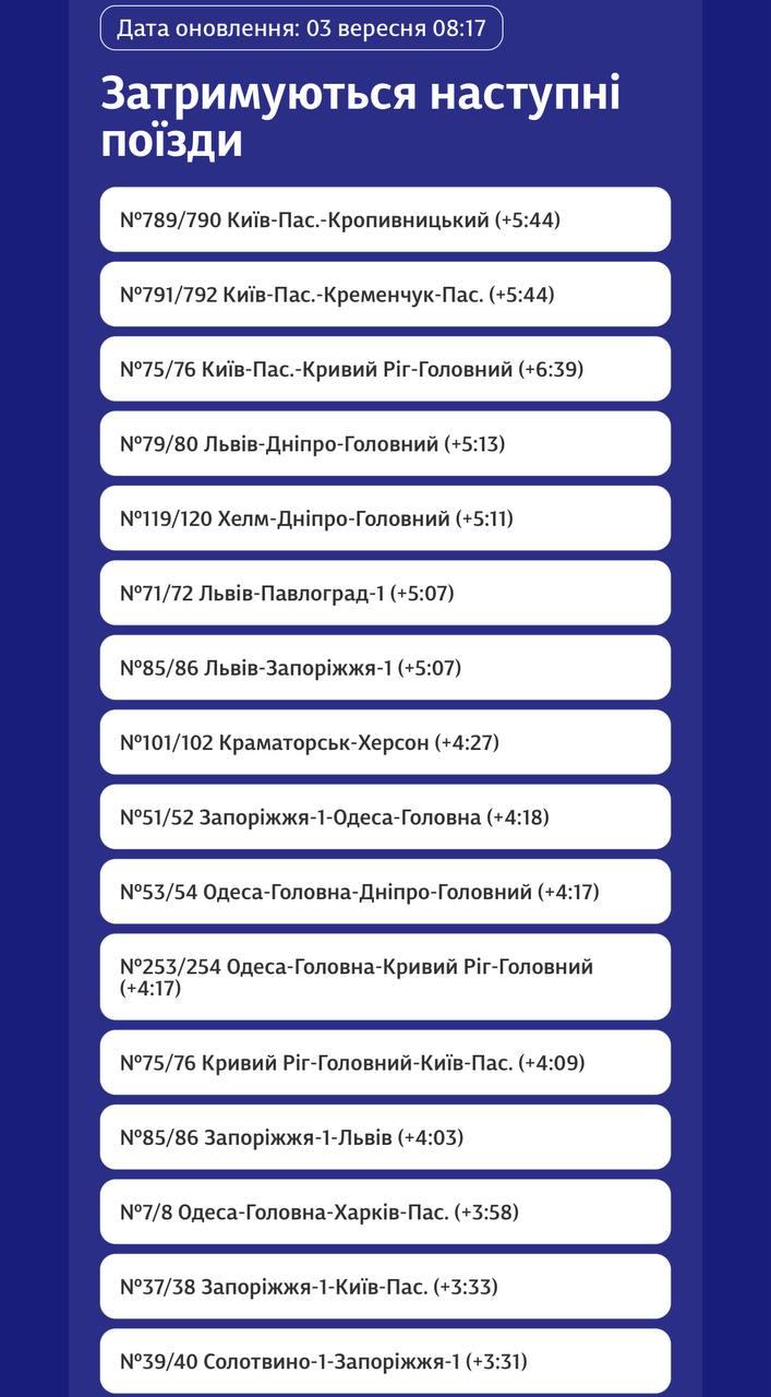 8.22 В Украине из-за ночной атаки задерживается множество поездов, сообщает "Укрзализныця".
