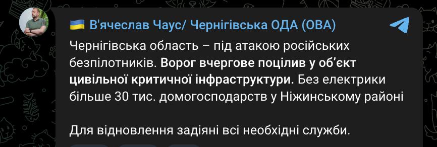 Удар по объекту инфраструктуры был и в Нежинском районе Черниговской области, где остались без света более 30 тысяч домохозяйств. Об этом сообщил глава Черниговской ОВА Вячеслав Чаус.