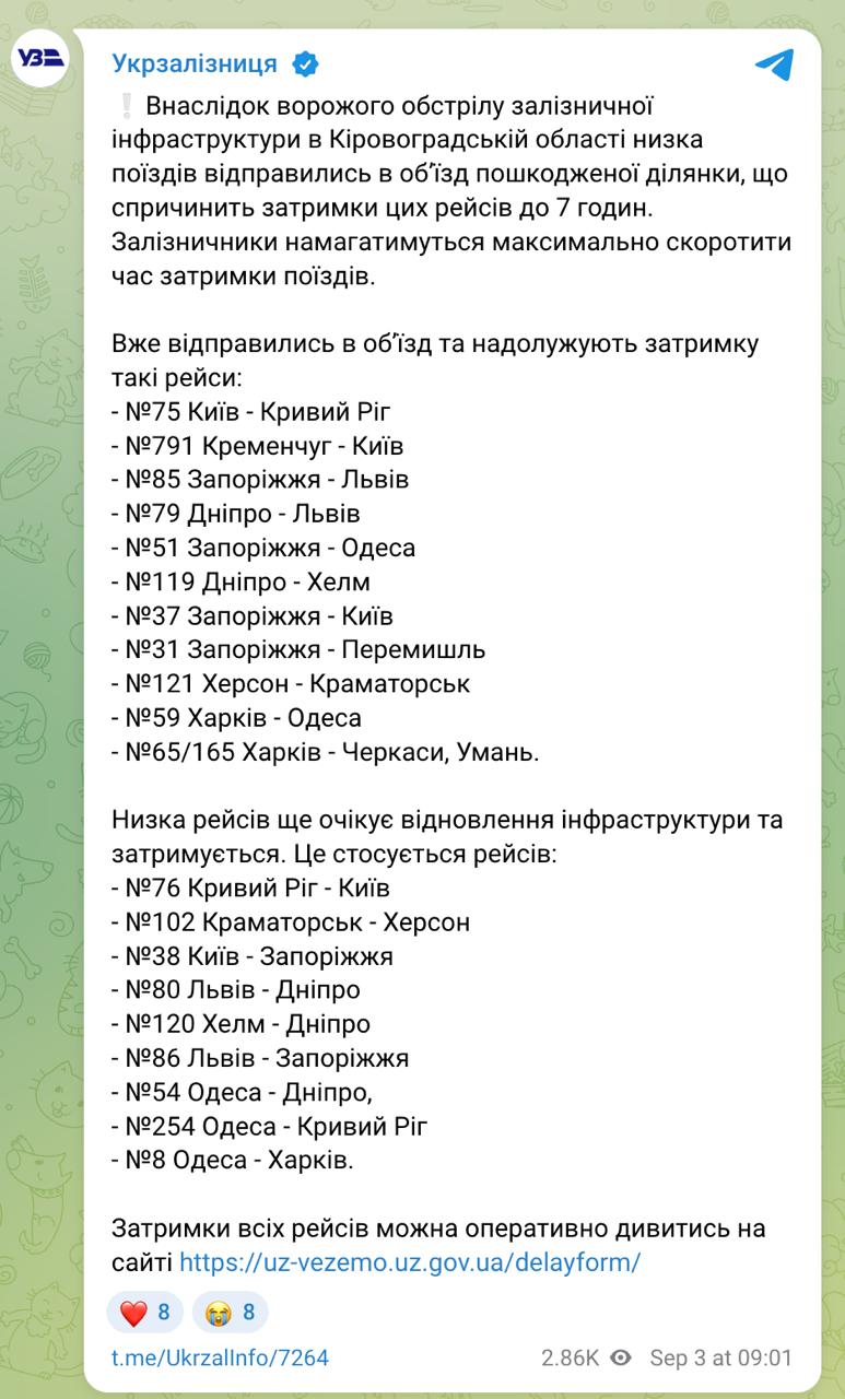 Кроме того, в Украине из-за ночной атаки задерживаются множество поездов, сообщает компания "Укрзализныця" и публикует соответствующий график. Добавляется, что задержки составляют более 7 часов.