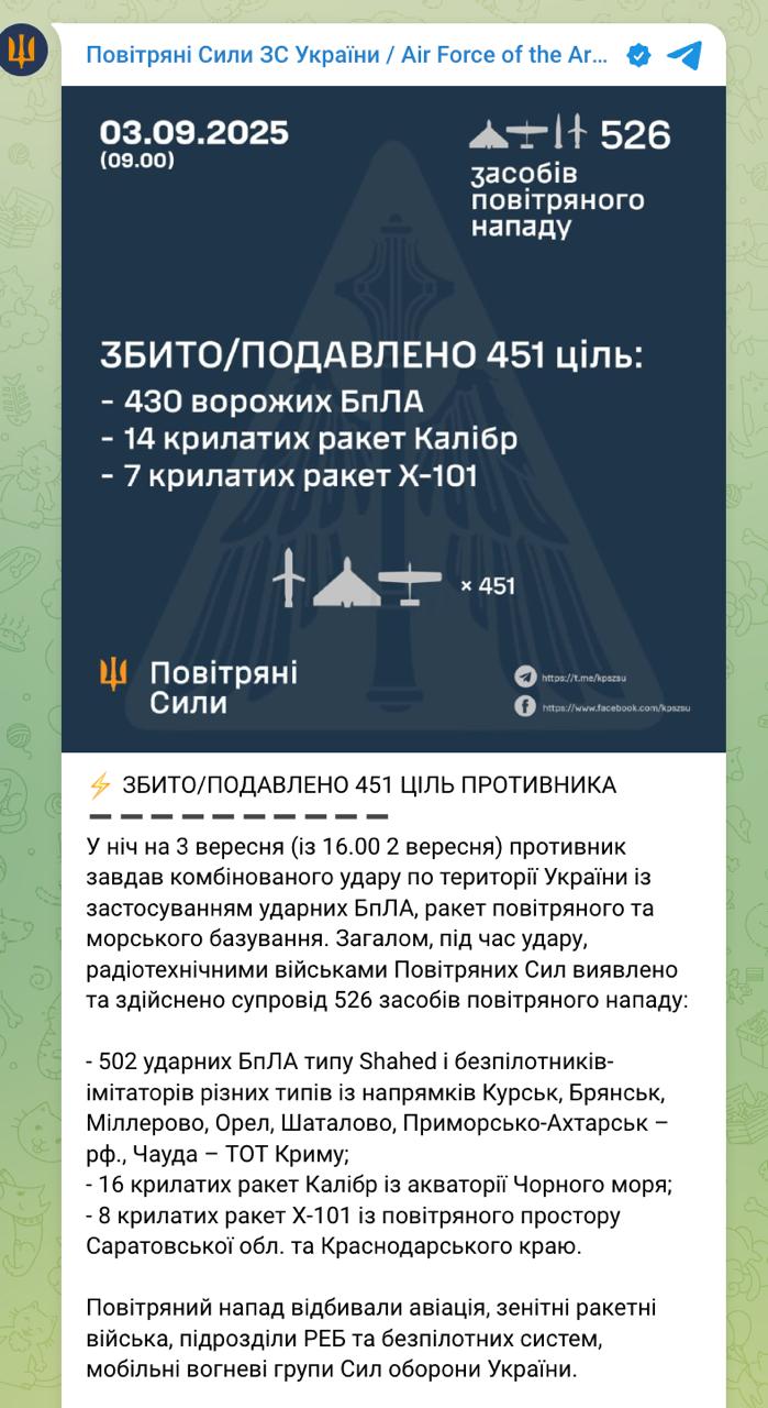 В Воздушных силах ВСУ сообщили, что Украину ночью атаковали 502 БПЛА и 24 крылатые ракеты, было 72 прилета. Сбить удалось 451 дрон ("Шахеды" и имитаторы) и 21 ракету.