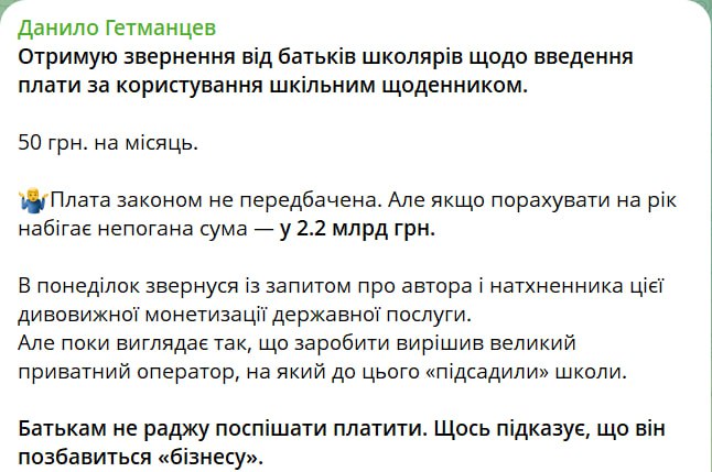 "Плата законом не предусмотрена. Но если сосчитать на год, набегает неплохая сумма – в 2,2 млрд грн. В понедельник обращусь с запросом об авторе и вдохновителе этой удивительной монетизации государственной услуги. Но пока выглядит так, что заработать решил крупный частный оператор, на которого до этого "подсадили" школы. Родителям не советую спешить платить. Что-то подсказывает, что он лишится "бизнеса"", – написал Гетманцев.