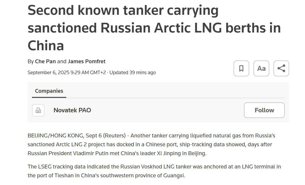 Первый же танкер, "Арктик Мулан" доставил газ в Китай в конце августа. Это газ, добытый на российском заводе Арктик СПГ-2, находящийся под санкциями.