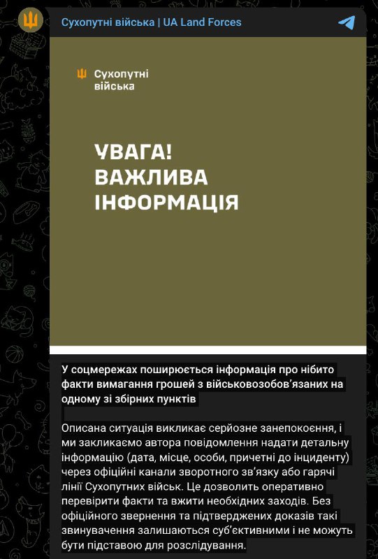 "В соцсетях распространяется информация о якобы фактах вымогательства денег с военнообязанных в одном из сборных пунктов. Описанная ситуация вызывает серьёзную обеспокоенность, и мы призываем автора сообщения предоставить детальную информацию (дату, место, лиц, причастных к инциденту) через официальные каналы обратной связи или горячие линии Сухопутных войск. Это позволит оперативно проверить факты и принять необходимые меры. Без официального обращения и подтверждённых доказательств такие обвинения остаются субъективными и не могут служить основанием для расследования", - заявили в Сухопутных войсках.