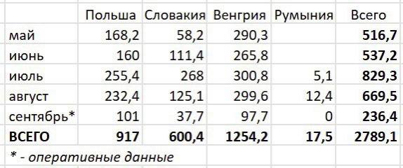 В сентябрьских поставках углеводородов первое место традиционно занял ресурс, импортируемый из Венгрии и Словакии (145 млн кубов). В этих странах почти весь газ имеет российское происхождение.