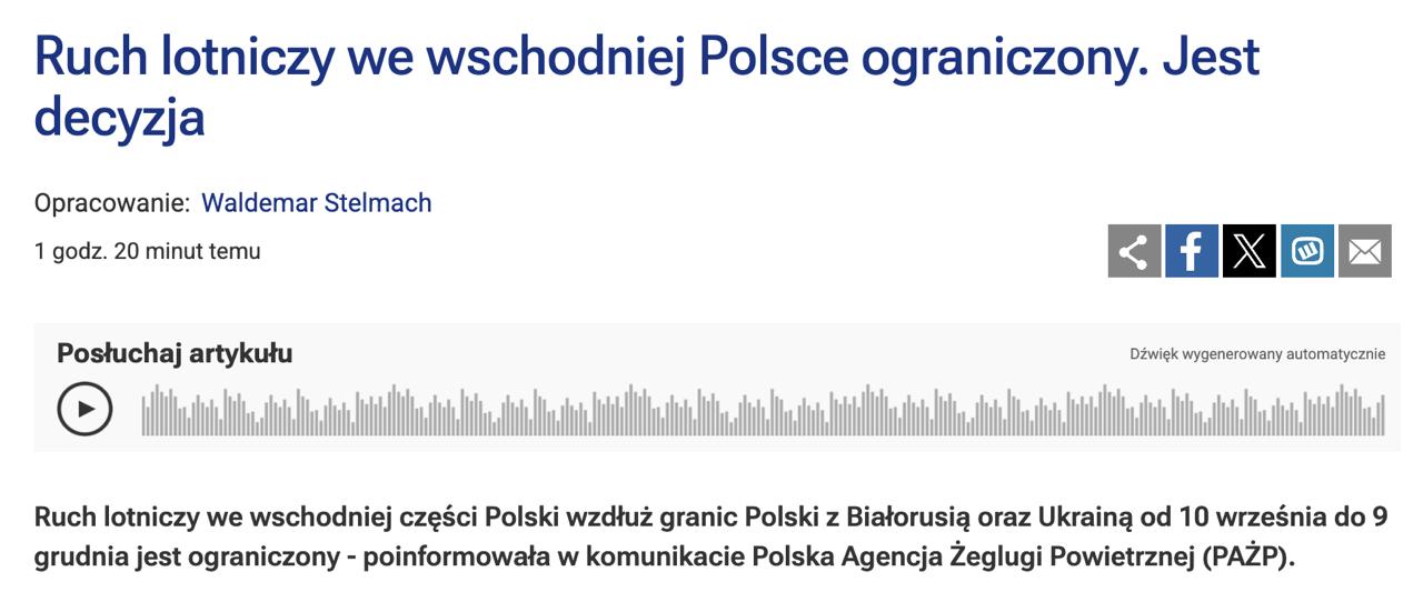 Власти Польши ограничили авиационное сообщение в восточной части страны у границы с Украиной и Беларусью.