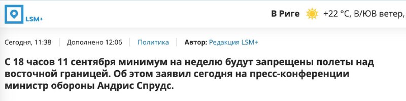 Вместе с Польшей Латвия минимум на неделю тоже запретила полеты над своей восточной границей с Беларусью и Россией.