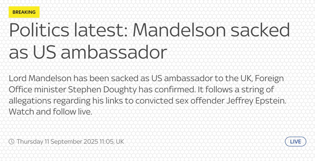 МИД Великобритании уволили посла в США Питера Мандельсона из-за связи с сексуальным преступником Джеффри Эпштейном.