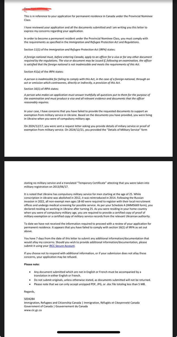 "В Украине существует обязательная военная служба для мужчин, начиная с 25 лет. Хотя призыв в Украине был отменен в 2012 году, его возобновили в 2014 году. После российского вторжения в 2022 году все мужчины в возрасте от 18 до 60 лет, не имевшие увольнения, были обязаны зарегистрироваться в местных военкоматах и пройти медицинское освидетельствование для возможной службы. Согласно вашей Анкете А (форма IMM5669), вы указали, что проживали и работали в Украине после достижения 25 лет. Поскольку вы проживали в своей стране во время пребывания в возрасте обязательного призыва, вы должны предоставить заверенную копию документа об освобождении от военной службы или заверенную копию военных документов, выданных соответствующим украинским органом", – ответил офицер.