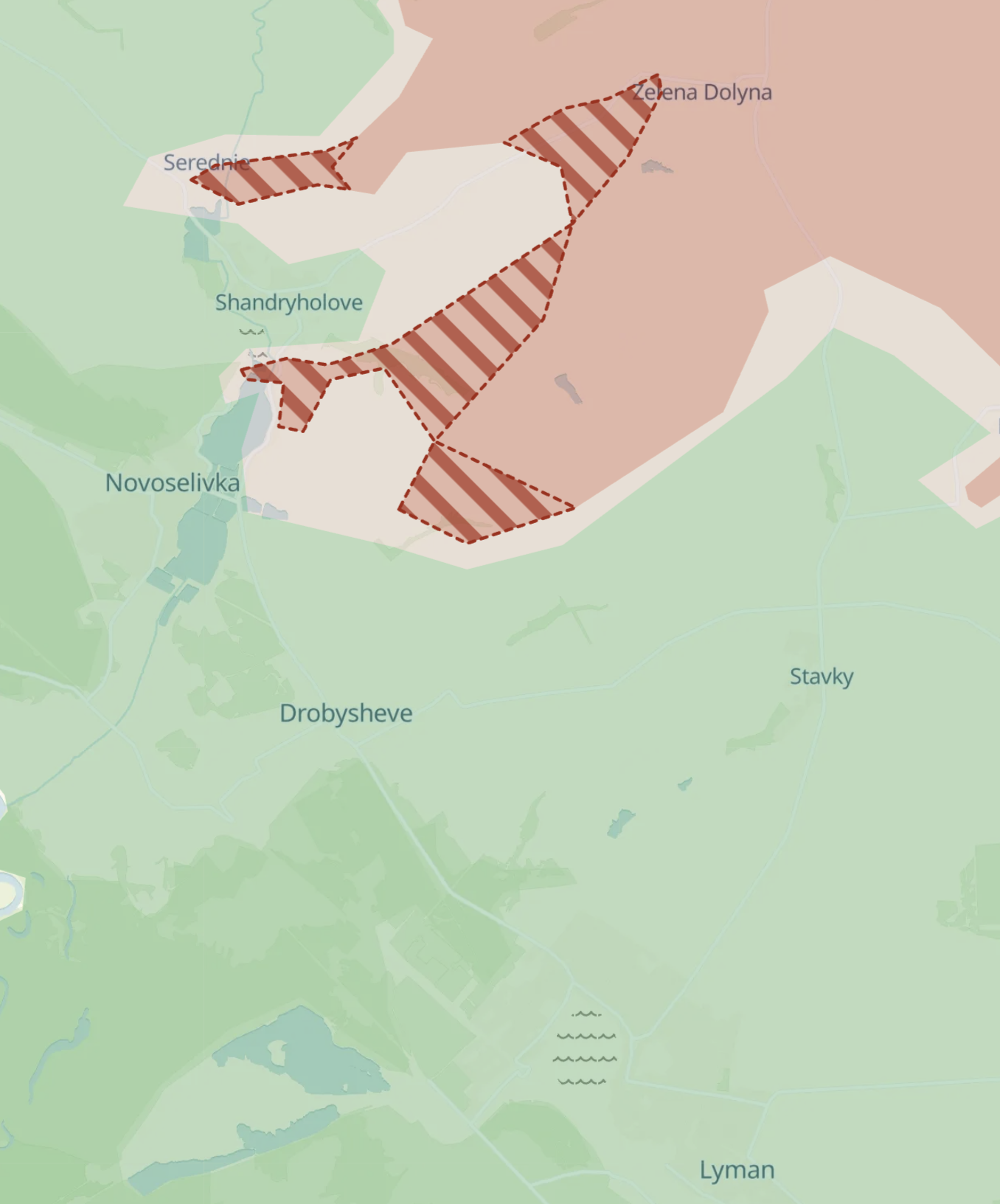 Армия РФ продвинулась к северу от Лимана Донецкой области - районе сел Среднее и Шандриголово, сообщает военный паблик Deep State.
