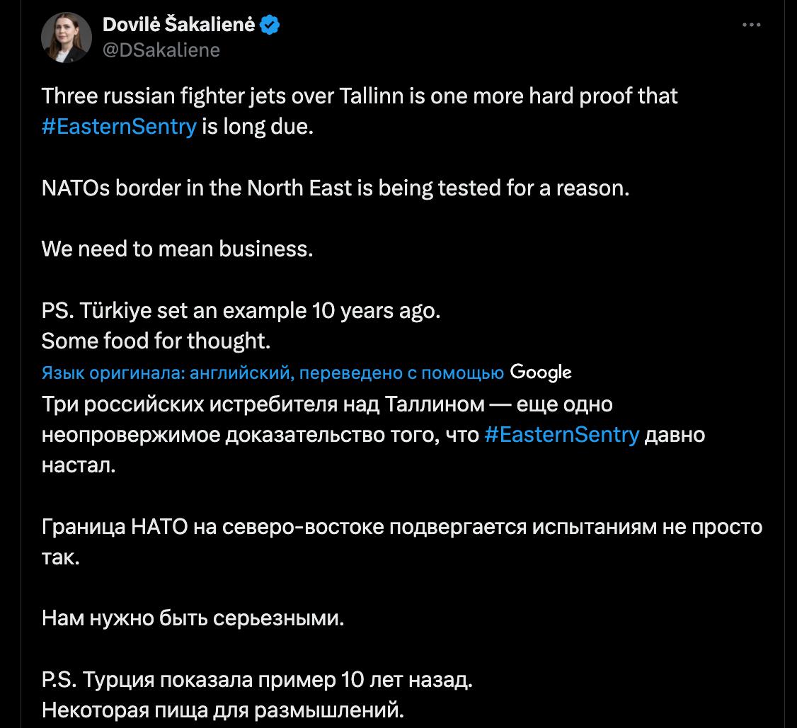 "Три российских истребителя над Таллинном - ещё одно твёрдое доказательство того, что "Восточный страж" (инициатива НАТО после залета российских дронов в Польшу - Ред.) давно назрел. Северо-восточная граница НАТО проверяется не просто так. Мы должны действовать всерьёз. Турция показала пример 10 лет назад. Есть над чем задуматься", - написала министр.