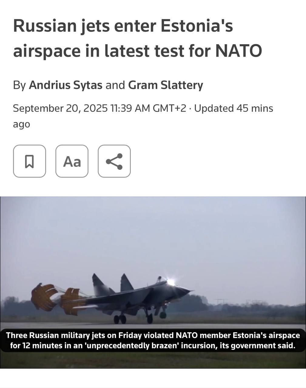 Напомним, Эстония вчера обвинила Россию в нарушении ее воздушного пространства тремя истребителями МиГ-31. РФ это опровергает.