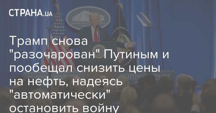 Президент США Дональд Трамп снова заявил о "разочаровании" российским главрй Владимиром Путиным и пообещал снижать цены на нефть. Таким образом он надеется "автоматически" остановить войну в Украине.