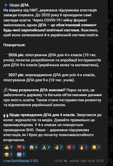 Ранее сообщалось, что с 2027 года украинские школьники после окончания 4-го класса в обязательном порядке будут проходить государственную итоговую аттестацию в формате внешнего независимого оценивания, но, как видим, эта информация опровергнута.