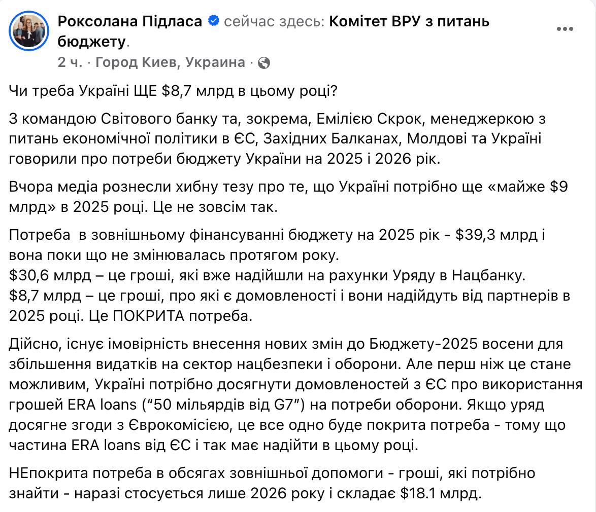 Вчера министр финансов сообщил, что в 2025 году было привлечено более 30,6 миллиардов долларов внешнего финансирования, тогда как потребность Украины на текущий год составляет 39,3 миллиардов долларов.