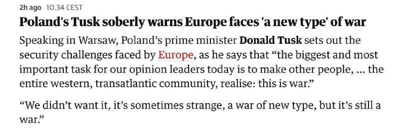 Между тем польский премьер-министр Дональд Туск уверен, что Европа уже находится в состоянии войны. Как передает The Guardian, Туск назвал происходящее "новым типом" войны.