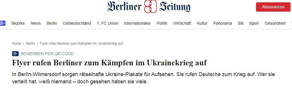 В Берлине появились листовки, призывающие жителей столицы воевать в Украине.