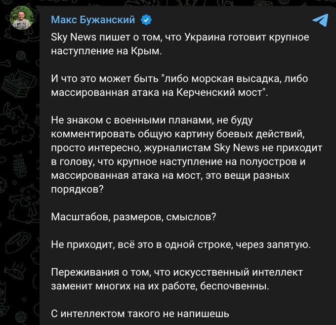 "Sky News пишет о том, что Украина готовит крупное наступление на Крым. И что это может быть "либо морская высадка, либо массированная атака на Керченский мост". Не знаком с военными планами, не буду комментировать общую картину боевых действий, просто интересно, журналистам Sky News не приходит в голову, что крупное наступление на полуостров и массированная атака на мост - это вещи разных порядков? Масштабов, размеров, смыслов? Не приходит: всё это в одной строке, через запятую", - написал нардеп от партии "Слуга народа" Максим Бужанский.