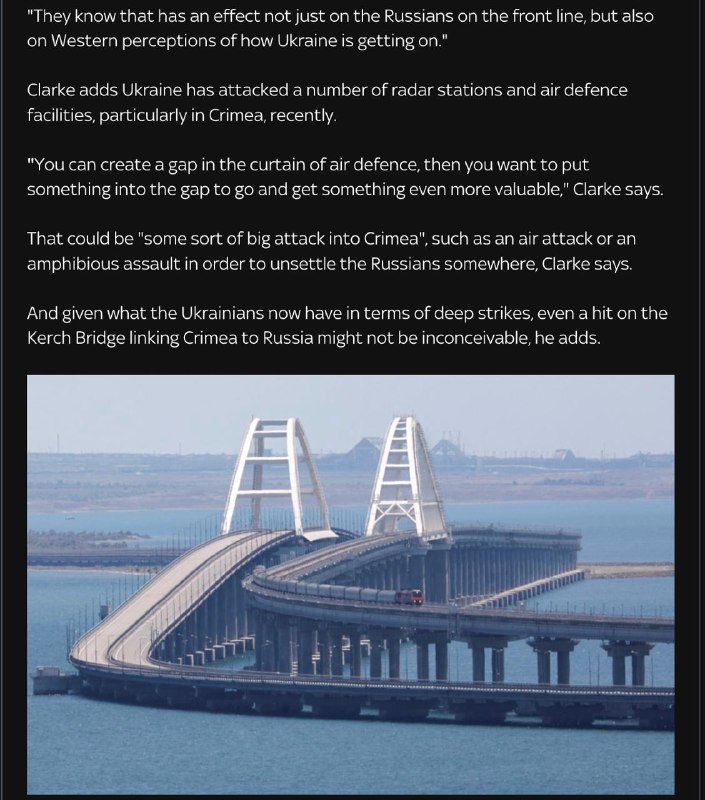 08:44 Украина может предпринять крупную атаку на Крым, например, попытаться высадить там десант или ударить по Керченскому мосту, заявил военный эксперт Майкл Кларк в эфире Sky News.