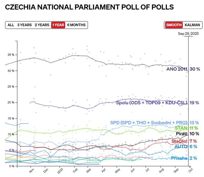 По опросам Politico, партия Бабиша ANO имеет 30% поддержки, блок премьера Петра Фиалы 19%, а националисты из партии "Свобода и прямая демократия" (SPD) — 13%.