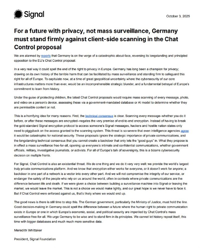 Уиттакер призвала немецкое правительство, особенно Минюст, "проявить мудрость и остаться верным своим принципам", чтобы Европа не превратилась в пространство тотального цифрового контроля.